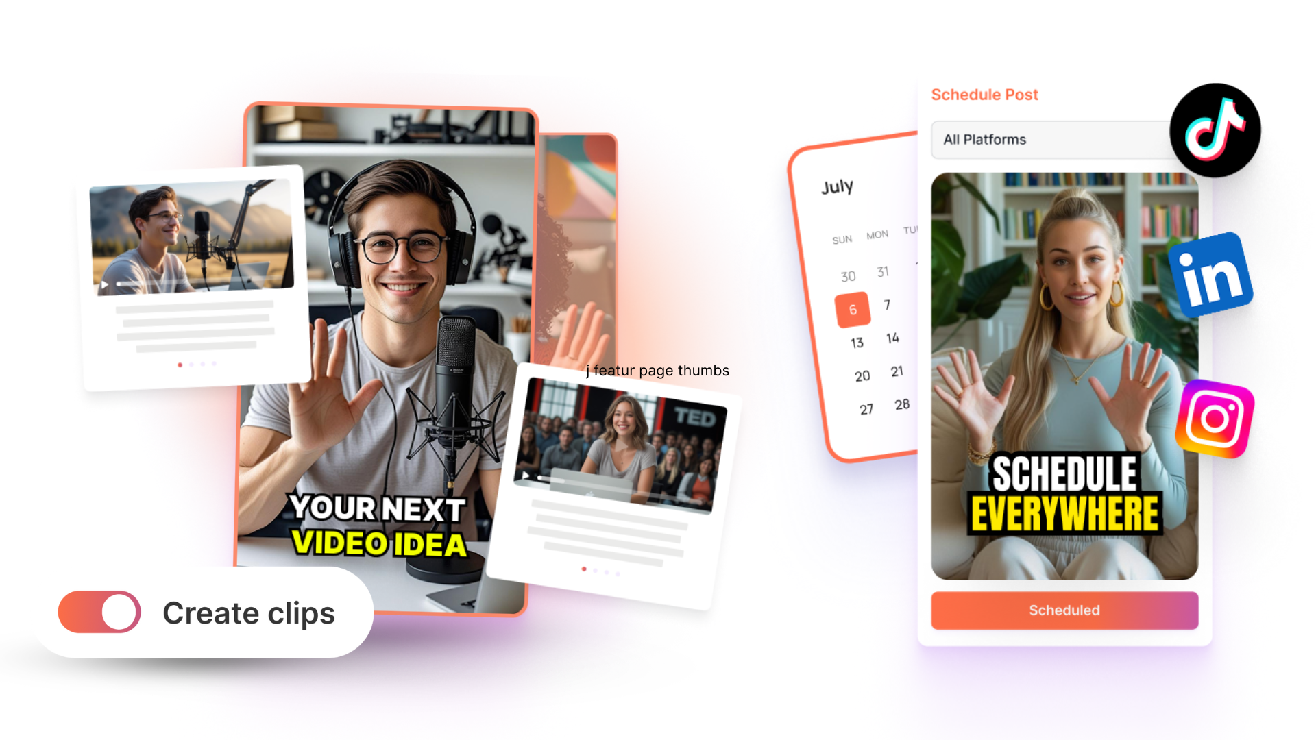 Generate scroll-stopping social posts from any video and schedule them to go live on all platforms—automatically.